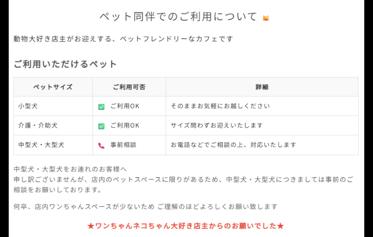 | 備考 | 動物大好き店主がお迎えする、ペットフレンドリーなカフェです。 [中型犬・大型犬をお連れのお客様へ] 申し訳ございませんが、店内のペットスペースに限りがあるため、中型犬・大型犬につきましては事前のご相談をお願いしております。 |