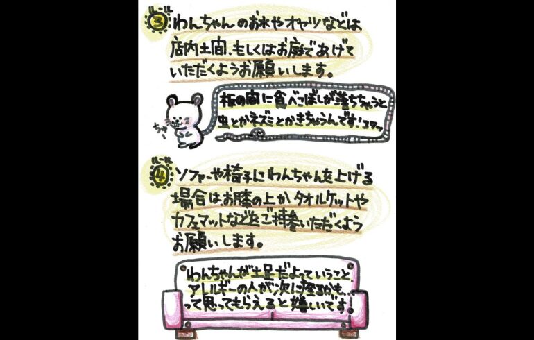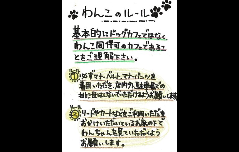 | 備考 | わんこのルール ・マナーベルト、マナーパンツ着用 ・要リードやカート ・わんちゃんのお水、おやつなどは店内土間、お庭であげていただくようお願いします ・ソファや椅子にわんちゃんを上げる場合は、お膝の上かタオルケット、カフェマットなどをご持参いただくようお願いします |