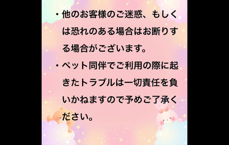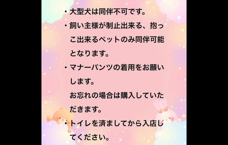 | 備考 | InstagramDM不可 ※お問い合わせは店舗電話のみ ※大型犬は同伴不可 |