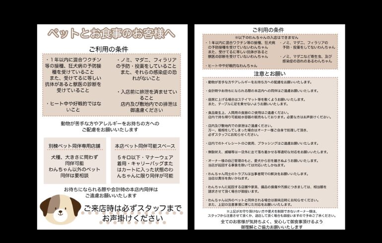 | 備考 | ペット同伴スペースは室内(別棟)に3席 ※テラスにも3席ございますので、お天気の良い日などは山中湖の風に当たりながらのお食事も楽しめます ※要マナーウェア着用(マナーウェア着用のわんちゃんに限り入店可能) |