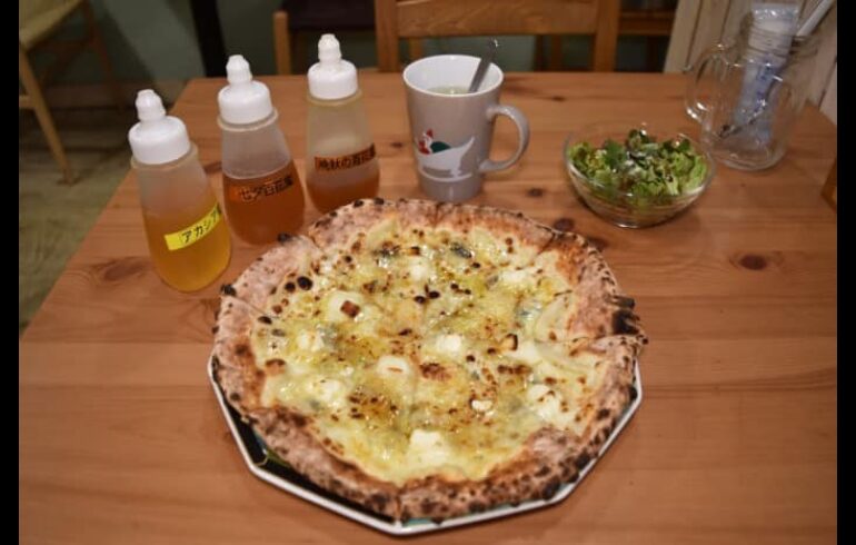 お店の3階で養蜂している蜂蜜をかけて焼くクワトロフォルマッジは絶品ですよ