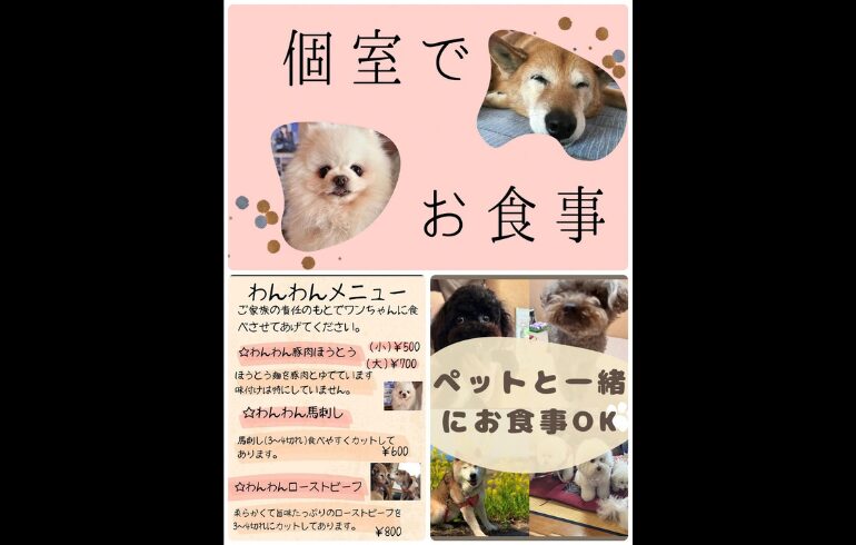 | 備考 | ワンちゃんと一緒に個室でお食事ができます ※要予約(室料90分1000円) |